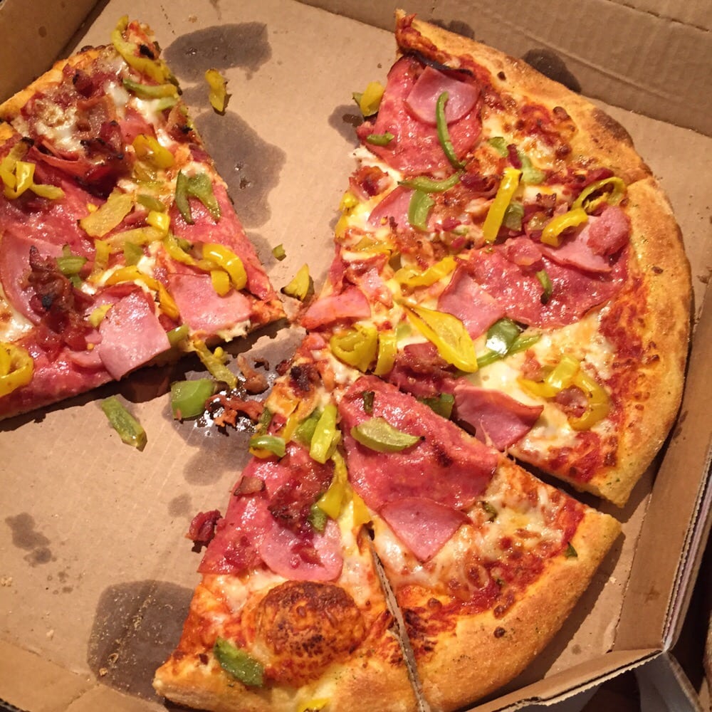 loads of pepperoni, ham, italian sausage, beef, fresh onions, fresh green peppers, fresh mushrooms and black olives topped with extra cheese made with 100% real mozzarella.